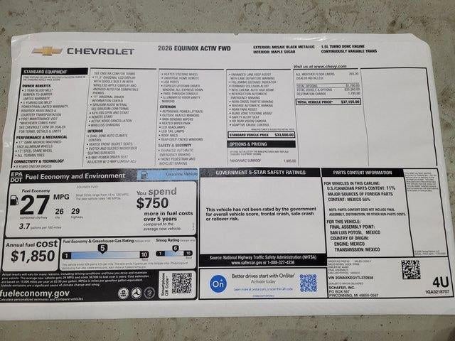 2026 Chevrolet Equinox ACTIV with a Navigation System, LEATHER!, HEATED SEATS, Sunroof/Moonroof, Backup Camera, REMOTE START, 4D Sport Utility, 1.5L DOHC, CVT, FWD, 4-Wheel Disc Brakes, 6 Speakers, Air Conditioning, Alloy wheels, AM/FM radio: SiriusXM, Auto High-beam Headlights, Brake assist, Driver vanity mirror, Dual front side impact airbags, Emergency communication system: OnStar and Chevrolet connected services capable, Four wheel independent suspension, Heated door mirrors, Heated Driver & Front Passenger Seats, Heated steering wheel, Memory seat, Navigation System, Occupant sensing airbag, Outside temperature display, Panic alarm, Power Dual Glass Panoramic Sliding Sunroof, Power Liftgate, Power windows, Premium audio system: Chevrolet Infotainment 3 Plus, Radio: 11.3 Diagonal Advanced Color LCD Display, Rain sensing wipers, Remote keyless entry, SiriusXM w/360L Trial Subscription, Speed control, Split folding rear seat, Steering wheel mounted audio controls, Traction control. 26/28 City/Highway MPG
