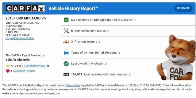 This Performance White 2013 Ford Mustang V6 has a NADA retail value of $11,100, CLEAN CARFAX!, 2D Convertible, 3.7L V6 Ti-VCT 24V, 6-Speed Automatic, RWD, 4-Wheel Disc Brakes, Air Conditioning, Alloy wheels, Brake assist, CD player, Convertible roof lining, Delay-off headlights, Dual front impact airbags, Front wheel independent suspension, Occupant sensing airbag, Outside temperature display, Panic alarm, Power steering, Speed control, Steering wheel mounted audio controls, Tilt steering wheel, Traction control.
