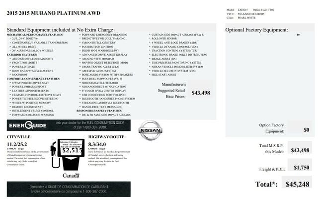 Recent Arrival! Pearl White 2015 Nissan Murano 3.5L V6 DOHC AWD CVT with Xtronic Clean CARFAX. CLEAN CARFAX!, LEATHER!, HEATED SEATS, Backup Camera, 4D Sport Utility, 3.5L V6 DOHC, CVT with Xtronic, AWD, 11 Speakers, 4-Wheel Disc Brakes, ABS brakes, Air Conditioning, AM/FM radio, Brake assist, Delay-off headlights, Dual front impact airbags, Dual front side impact airbags, Four wheel independent suspension, Heated & Cooled Front Bucket Seats, Heated door mirrors, Heated rear seats, Heated steering wheel, Leather Appointed Seat Trim, Memory seat, Occupant sensing airbag, Outside temperature display, Panic alarm, Power Liftgate, Power steering, Radio: AM/FM/CD Audio System w/Navigation, Rear reading lights, Rear window defroster, Remote keyless entry, Speed control, Split folding rear seat, Steering wheel mounted audio controls, Tilt steering wheel, Traction control, Wheels: 20 Machined Aluminum-Alloy.