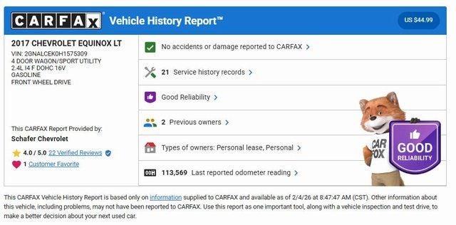 Schafer Chevrolet is proud to have a 4.5 star Google review rating on over 1,000 reviews by real customers just like you. Our store has been reliable and trusted for our 90 years in business. Schafer Chevrolet is the only dealer to give you all this! Our inventory moves fast! So get off the internet now, and give us a call or come in! You'll be glad you did! * 3 day return policy is only available on vehicles less than ten years of age and under 100,000 miles. Limited to 150 miles after purchase. $500 restocking fee applies.** 6 month/6,000 mile limited powertrain warranty only pertains to vehicles with under 100,000 miles and less than ten years of age.
