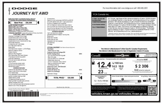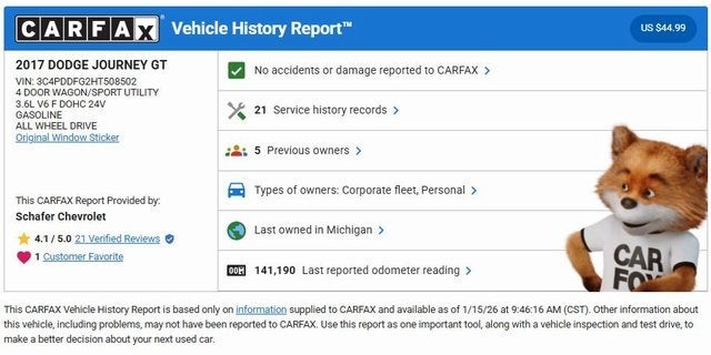 This Pitch Black Clearcoat 2017 Dodge Journey GT has a NADA retail value of $7,375, CLEAN CARFAX!, LEATHER!, HEATED SEATS, Backup Camera, Park Assist/Parking Sensors, REMOTE START (2), 4D Sport Utility, 3.6L V6 24V VVT, 6-Speed Automatic, AWD, 19 x 7 Painted Aluminum Wheels, 3rd row seats: bench, 4-Wheel Disc Brakes, 7 Speakers, Air Conditioning, AM/FM radio: SiriusXM, Anti-whiplash front head restraints, Brake assist, CD player, Delay-off headlights, Dual Bright Exhaust Tips, Dual front impact airbags, Dual front side impact airbags, Heated front seats, Heated steering wheel, Occupant sensing airbag, Outside temperature display, Panic alarm, Power driver seat, Radio: Uconnect 3 w/8.4 Display, Rear air conditioning, Reclining 3rd row seat, Remote keyless entry, Speed control, Steering wheel mounted audio controls, Tilt steering wheel, Traction control.