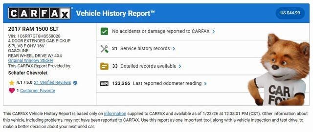 Schafer Chevrolet is proud to have a 4.5 star Google review rating on over 1,000 reviews by real customers just like you. Our store has been reliable and trusted for our 90 years in business. Schafer Chevrolet is the only dealer to give you all this! Our inventory moves fast! So get off the internet now, and give us a call or come in! You'll be glad you did! * 3 day return policy is only available on vehicles less than ten years of age and under 100,000 miles. Limited to 150 miles after purchase. $500 restocking fee applies.** 6 month/6,000 mile limited powertrain warranty only pertains to vehicles with under 100,000 miles and less than ten years of age.