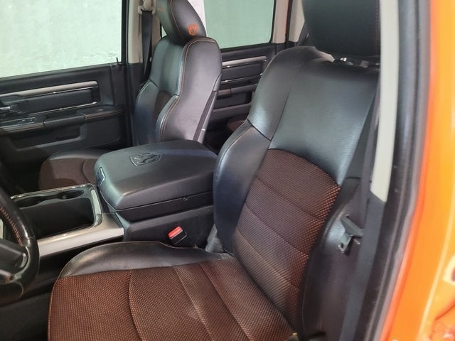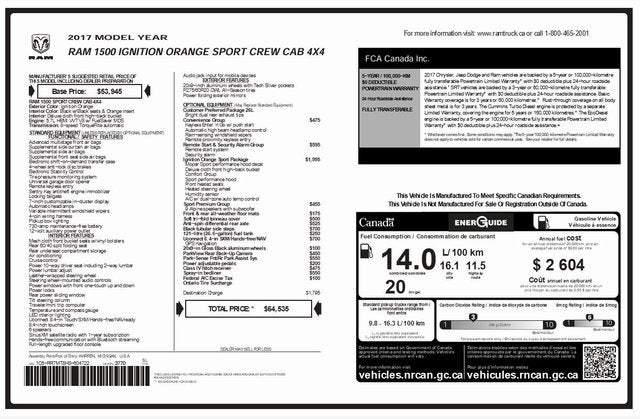 This Ignition Orange Clearcoat 2017 Ram 1500 Sport has a NADA retail value of $25,725, Navigation System, HEATED SEATS, Backup Camera, Park Assist/Parking Sensors, REMOTE START, 4D Crew Cab, HEMI 5.7L V8 Multi Displacement VVT, 8-Speed Automatic, 4WD, 115V Auxiliary Power Outlet, 6 Speakers, ABS brakes, Alloy wheels, Bucket Seats, Compass, Electronic Stability Control, Folding Flat Load Floor Storage, Front dual zone A/C, Full Length Upgraded Floor Console, Heated door mirrors, Heated Front Seats, Heated front seats, Heated Steering Wheel, High Back Seats, Illuminated entry, Leather Trimmed Bucket Seats, Low tire pressure warning system, Navigation System, ParkView Rear Back-Up Camera, Power 10-Way Driver & 6-Way Passenger Seats, Power driver seat, Power Lumbar Adjust, Rear 60/40 Split Folding Seat, Remote keyless entry, Remote Proximity Keyless Entry, Steering wheel mounted audio controls, Traction control, Ventilated Front Seats.