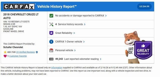 This Summit White 2018 Chevrolet Cruze LT has a NADA retail value of $13,050, ONE OWNER, HEATED SEATS, Backup Camera, REMOTE START, 4D Sedan, 1.4L 4-Cylinder Turbo DOHC CVVT, 6-Speed Automatic, FWD, 16 Aluminum Wheels, 4-Wheel Disc Brakes, 6-Speaker Audio System Feature, Air Conditioning, All-Weather Floor Liners (LPO), Apple CarPlay/Android Auto, Brake assist, Cloth Seat Trim, Delay-off headlights, Driver 6-Way Manual Seat Adjuster, Driver 8-Way Power Seat Adjuster, Dual front impact airbags, Dual front side impact airbags, Emergency communication system: OnStar Guidance, Exterior Parking Camera Rear, Front wheel independent suspension, Heated Driver & Front Passenger Seat, Occupant sensing airbag, Outside temperature display, Panic alarm, Radio: AM/FM Chevrolet MyLink w/7 Touch-Screen, Remote keyless entry, SiriusXM Satellite Radio, Speed control, Steering wheel mounted audio controls, Tilt steering wheel.