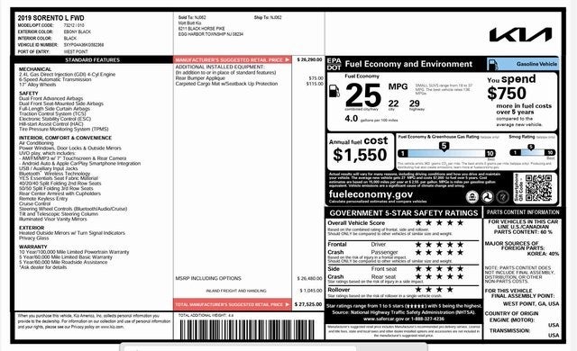 This Ebony Black 2019 Kia Sorento L has a NADA retail value of $8,750, Backup Camera, 4D Sport Utility, I4, 6-Speed Automatic with Sportmatic, FWD, 17 x 7.0 Alloy Wheels, 3rd row seats: split-bench, 4-Wheel Disc Brakes, 6 Speakers, ABS brakes, Air Conditioning, Apple CarPlay & Android Auto, Brake assist, Delay-off headlights, Dual front impact airbags, Exterior Parking Camera Rear, Four wheel independent suspension, Front Center Armrest, Heated door mirrors, Occupant sensing airbag, Outside temperature display, Overhead airbag, Panic alarm, Power steering, Radio: UVO Play w/AM/FM/MP3, Speed control, Steering wheel mounted audio controls, Tilt steering wheel, Traction control.