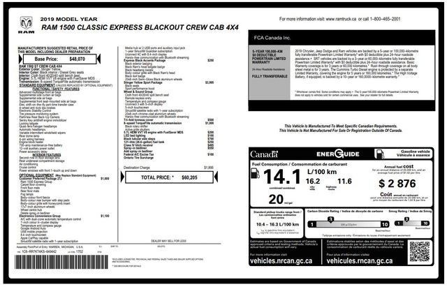 Recent Arrival! Stinger Yellow Clearcoat 2019 Ram 1500 Classic Express HEMI 5.7L V8 Multi Displacement VVT 4WD 8-Speed Automatic CARFAX One-Owner. has a NADA retail value of $21,175, Backup Camera, 4D Crew Cab, HEMI 5.7L V8 Multi Displacement VVT, 8-Speed Automatic, 4WD, 17 x 7 Steel Wheels, 4-Wheel Disc Brakes, 40/20/40 Split Bench Seat, 6 Speakers, ABS brakes, Air Conditioning, AM/FM radio, Center Hub, Dual front side impact airbags, Electronic Stability Control, Front anti-roll bar, Front Armrest w/3 Cupholders, Fully automatic headlights, Heated door mirrors, Low tire pressure warning system, Media Hub (USB, AUX), Occupant sensing airbag, ParkView Rear Back-Up Camera, Power steering, Remote USB Port - Charge Only, Speed control, Tilt steering wheel, Tip Start, Traction control.