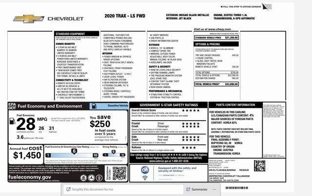 This Mosaic Black Metallic 2020 Chevrolet Trax LS CLEAN CARFAX!, Backup Camera, REMOTE START, 4D Sport Utility, ECOTEC 1.4L I4 SMPI DOHC Turbocharged VVT, 6-Speed Automatic, FWD, 16 Aluminum Wheels, 4-Way Manual Driver Seat Adjuster, 6 Speakers, 6-Speaker Audio System Feature, ABS brakes, Air Conditioning, Apple CarPlay/Android Auto, Cloth Seat Trim, Delay-off headlights, Dual front side impact airbags, Electronic Automatic Cruise Control, Emergency communication system: OnStar and Chevrolet connected services capable, Exterior Parking Camera Rear, Front wheel independent suspension, Occupant sensing airbag, Outside temperature display, Premium audio system: Chevrolet MyLink, Remote keyless entry, Remote Vehicle Starter System, Security system, Steering wheel mounted audio controls, Tilt steering wheel, Traction control.