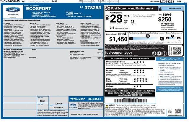 This Smoke Metallic 2020 Ford EcoSport SE ONE OWNER, HEATED SEATS, Sunroof/Moonroof, Backup Camera, Park Assist/Parking Sensors, 4D Sport Utility, EcoBoost 1.0L I3 GTDi DOHC Turbocharged VCT, 6-Speed Automatic, FWD, 4-Wheel Disc Brakes, ABS brakes, Air Conditioning, AppLink/Apple CarPlay and Android Auto, Brake assist, Delay-off headlights, Dual front side impact airbags, Emergency communication system: SYNC 3 911 Assist, Exterior Parking Camera Rear, Heated front seats, Illuminated entry, Occupant sensing airbag, Outside temperature display, Panic alarm, Power driver seat, Power moonroof, Radio: AM/FM Stereo w/MP3 Capable, Rear Parking Sensors, Rear side impact airbag, Remote keyless entry, SiriusXM Radio, Speed control, Steering wheel mounted audio controls, SYNC 3 Communications & Entertainment System, Tilt steering wheel, Traction control, Wheels: 16 Shadow Silver-Painted Aluminum.