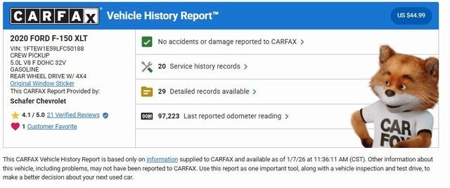 Schafer Chevrolet is proud to have a 4.5 star Google review rating on over 1,000 reviews by real customers just like you. Our store has been reliable and trusted for our 90 years in business. Schafer Chevrolet is the only dealer to give you all this! Our inventory moves fast! So get off the internet now, and give us a call or come in! You'll be glad you did! * 3 day return policy is only available on vehicles less than ten years of age and under 100,000 miles. Limited to 150 miles after purchase. $500 restocking fee applies.** 6 month/6,000 mile limited powertrain warranty only pertains to vehicles with under 100,000 miles and less than ten years of age.