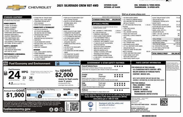 This Black 2021 Chevrolet Silverado 1500 RST has a NADA retail value of $42,000, CLEAN CARFAX!, HEATED SEATS, Backup Camera, Park Assist/Parking Sensors, REMOTE START (2)`, 4D Crew Cab, 3.0L I6, 10-Speed Automatic, 4WD, 10-Way Power Driver Seat w/Lumbar, 120-Volt Bed Mounted Power Outlet, 120-Volt Instrument Panel Power Outlet, 2 USB Ports, 2 USB Ports (First Row), 4-Wheel Disc Brakes, 4.2 Diagonal Color Display Driver Info Center, 40/20/40 Front Split-Bench Seat, 4G LTE Wi-Fi Hot Spot Capable, 6 Black Tubular Assist Steps (LPO), Air Conditioning, All Star Edition Plus, All-Star Edition, All-Weather Floor Liner (LPO) (AAK), Automatic temperature control, Bed Protection Package, Brake assist, Chevrolet Connected Access Capable, Chevytec Spray-On Black Bedliner, Cloth Rear Seat w/Storage Package, Convenience Package II, Delay-off headlights, Dual Exhaust w/Polished Outlets, Dual front impact airbags, Front wheel independent suspension, HD Radio, HD Rear Vision Camera, Heated Driver & Front Outboard Passenger Seats, Heated Steering Wheel, Heavy-Duty Air Filter, High Gloss Black Mirror Caps, Hill Descent Control, Leather Wrapped Steering Wheel, Low tire pressure warning system, Molded Black Splash Guards (LPO), Off-Road Suspension, OnStar & Chevrolet Connected Services Capable, Outside temperature display, Panic alarm, Power Door Locks, Power driver seat, Power Front Windows w/Passenger Express Down, Power Sliding Rear Window w/Rear Defogger, Premium Bose 7-Speaker Sound System, Radio: Chevrolet Infotainment 3 Plus System, Rear seat center armrest, Rear Wheelhouse Liners, Rear window defroster, Remote keyless entry, SiriusXM w/360L, Speed control, Steering wheel mounted audio controls, Tilt steering wheel, Traction control, Trip computer, Universal Home Remote, Wheels: 20 x 9 Painted Aluminum, Wireless Phone Projection, Z71 Off-Road & Protection Package, Z71 Off-Road Package.