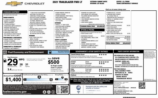 This Summit White 2021 Chevrolet TrailBlazer LT has a NADA retail value of $14,650, CLEAN CARFAX!, HEATED SEATS, Backup Camera, Park Assist/Parking Sensors, REMOTE START (2), 4D Sport Utility, 1.2L Ecotec Turbo DOHC DI w/VVT, CVT, FWD, 1 Type-A & 1 Type-C USB Charging-Only Ports, 120-Volt Power Outlet, 2-Way Power Driver Lumbar Seat Adjuster, 4-Way Manual Front Passenger Seat Adjuster, 4-Wheel Disc Brakes, 6-Speaker Audio System Feature, 8-Way Power Driver Seat Adjuster, 8 Diagonal Color Touchscreen Display, Air Conditioning, Apple CarPlay/Android Auto, Brake assist, Cabin Humidity Sensor, Cloth Seat Trim, Dual front side impact airbags, Emergency communication system: OnStar and Chevrolet connected services capable, Exterior Parking Camera Rear, Flat-Folding Front Passenger Seatback, Front fog lights, Fully automatic headlights, Heated door mirrors, Heated Driver & Front Passenger Seats, Lane Change Alert w/Side Blind Zone Alert, Occupant sensing airbag, Panic alarm, Power windows, Radio: Chevrolet Infotainment 3 System, Rear Park Assist, Single-Zone Auto Climate Control Air Conditioning, Speed control, Steering wheel mounted audio controls, Tilt steering wheel, Traction control, Trip computer, Wheels: 17 High Gloss Black Machined Aluminum, Wireless Apple CarPlay/Android Auto.