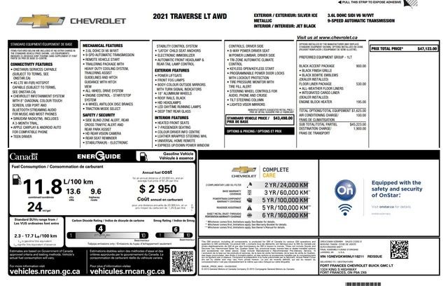 Recent Arrival! Silver Ice Metallic 2021 Chevrolet Traverse LT 1LT 1LT 3.6L V6 SIDI VVT AWD 9-Speed Automatic. CLEAN CARFAX!, HEATED SEATS, Backup Camera, Park Assist/Parking Sensors, REMOTE START, 4D Sport Utility, 3.6L V6 SIDI VVT, 9-Speed Automatic, AWD, 3rd row seats: split-bench, 4-Wheel Disc Brakes, 6 Speakers, 7-Passenger Seating (2-2-3 Seating Configuration), Air Conditioning, AM/FM radio: SiriusXM, Apple CarPlay/Android Auto, Brake assist, Delay-off headlights, Dual front side impact airbags, Emergency communication system: OnStar and Chevrolet connected services capable, Front dual zone A/C, Garage door transmitter, Heated front seats, Occupant sensing airbag, Outside temperature display, Panic alarm, Power driver seat, Power Liftgate, Power windows, Radio: Chevrolet Infotainment 3 Plus System, Rear window defroster, SiriusXM w/360L, Speed control, Speed-sensing steering, Steering wheel mounted audio controls, Tilt steering wheel, Traction control, Wheels: 18 Bright Silver Painted Aluminum.