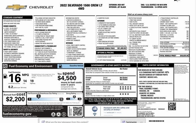 This Red Hot 2022 Chevrolet Silverado 1500 LT 4WD Z71 has a NADA retail value of $39,125, HEATED SEATS, Backup Camera, REMOTE START (2), Off-Road Package, 4D Crew Cab, EcoTec3 5.3L V8, 10-Speed Automatic, 4WD, 120-Volt Bed Mounted Power Outlet, 4-Wheel Disc Brakes, 6-Speaker Audio System, Air Conditioning, All-Weather Floor Liner (LPO) (AAK), Auto High-beam Headlights, Bluetooth® For Phone, Brake assist, Chevytec Spray-On Black Bedliner, Cloth Seat Trim, Dual Exhaust w/Polished Outlets, Dual front side impact airbags, EZ Lift Power Lock & Release Tailgate, Front wheel independent suspension, Heated door mirrors, Heated Driver & Front Outboard Passenger Seats, Heated front seats, Heated steering wheel, Heavy-Duty Air Filter, Hill Descent Control, Hitch Guidance, Occupant sensing airbag, Off-Road Suspension, Outside temperature display, Panic alarm, Power Front Windows w/Driver Express Up/Down, Premium audio system: Chevrolet Infotainment 3 Premium, Protection Package, Rear Wheelhouse Liners, Rear window defroster, Remote keyless entry, SiriusXM w/360L, Speed control, Steering Wheel Audio Controls, Steering wheel mounted audio controls, Tilt steering wheel, Traction control, Trailering App, Trailering Package, Trip computer, Universal Home Remote, Wheels: 18 x 8.5 Bright Silver Painted Aluminum, Z71 Off-Road & Protection Package, Z71 Off-Road Package.