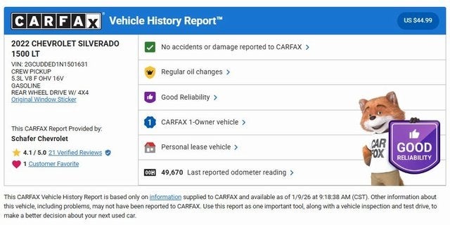 Schafer Chevrolet is proud to have a 4.5 star Google review rating on over 1,000 reviews by real customers just like you. Our store has been reliable and trusted for our 90 years in business. Schafer Chevrolet is the only dealer to give you all this! Our inventory moves fast! So get off the internet now, and give us a call or come in! You'll be glad you did! * 3 day return policy is only available on vehicles less than ten years of age and under 100,000 miles. Limited to 150 miles after purchase. $500 restocking fee applies.** 6 month/6,000 mile limited powertrain warranty only pertains to vehicles with under 100,000 miles and less than ten years of age.
