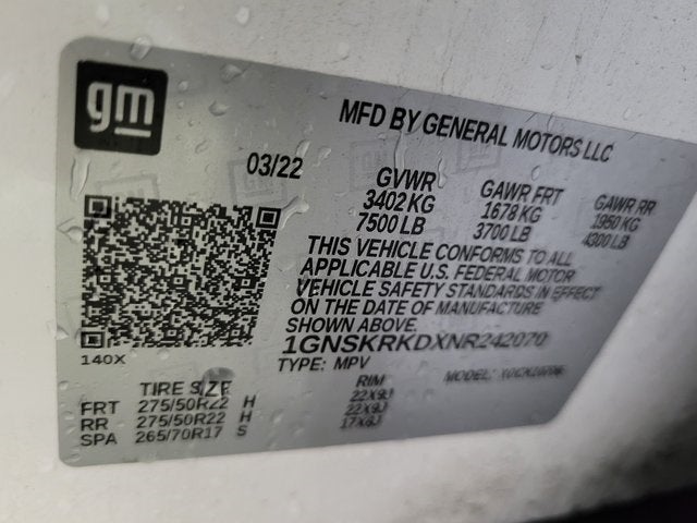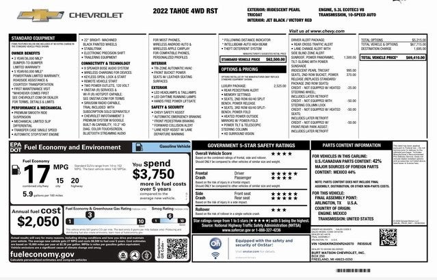 This Iridescent Pearl Tricoat 2022 Chevrolet Tahoe RST has a NADA retail value of $60,300, Navigation System, ONE OWNER, LEATHER!, HEATED SEATS, Sunroof/Moonroof, Backup Camera, Park Assist/Parking Sensors, REMOTE START (2), 4D Sport Utility, EcoTec3 5.3L V8, 10-Speed Automatic with Overdrive, 4WD, 10-Way Power Driver & Passenger Seat Adjusters, 1st & 2nd Row Color-Keyed Carpeted Floor Mats, 2nd Row Pwr Release 60/40 Split-Folding Bench Seat, 3rd Row 60/40 Power-Folding Split-Bench Seat, 3rd row seats: split-bench, 4-Wheel Disc Brakes, 9 Speakers, Air Conditioning, AM/FM radio: SiriusXM with 360L, Apple CarPlay/Android Auto, Auto High-beam Headlights, Automatic Stop/Start, Bose 9-Speaker Stereo Audio System Feature, Brake assist, Driver Alert Package, Driver door bin, Dual front side impact airbags, Dual-Pane Power Panoramic Sunroof, Emergency communication system: OnStar and Chevrolet connected services capable, Enhanced Driver Information Center, Four wheel independent suspension, Front Bucket Seats, Front dual zone A/C, Front reading lights, Garage door transmitter, Hands-Free Rear Power Programmable Liftgate, HD Surround Vision, Heated door mirrors, Heated Driver & Front Passenger Seats, Heated Steering Wheel, Lane Change Alert w/Side Blind Zone Alert, Leather steering wheel, Leather-Wrapped Steering Wheel, LED Daytime Running Lamps, Memory seat, Memory Settings for Driver, Navigation System, Occupant sensing airbag, Outside Heated Power-Adjustable Mirrors, Outside temperature display, Panic alarm, Power driver seat, Power steering, Power Tilt & Telescopic Steering Column, Radio: Chevrolet Infotainment 3 Premium System, Rear Cross Traffic Alert, Rear Pedestrian Alert, Rear seat center armrest, Remote keyless entry, Set of 4 Wheel Locks (LPO), Speed control, Steering wheel mounted audio controls, Tilt steering wheel, Traction control, Wheels: 22 x 9 Bright Machined.