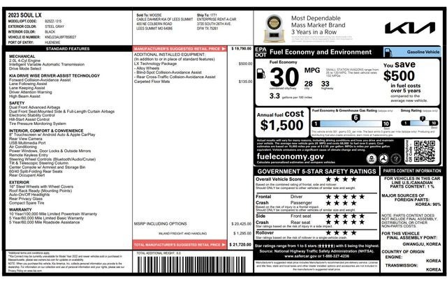 This Steel Gray 2023 Kia Soul LX has a NADA retail value of $15,575, Backup Camera, 4D Hatchback, 2.0L I4 DOHC, CVT, FWD, 16 Alloy Wheels, 4-Wheel Disc Brakes, ABS brakes, Air Conditioning, Apple CarPlay & Android Auto, Auto High-beam Headlights, Blind-Spot Collision-Avoidance Assist, Brake assist, Dual front side impact airbags, Exterior Parking Camera Rear, Lane Change Assist, LX Technology Package, Occupant sensing airbag, Outside temperature display, Panic alarm, Power steering, Radio data system, Rear Cross-Traffic Collision Avoidance Assist, Remote keyless entry, Speed control, Split folding rear seat, Steering wheel mounted audio controls, Tilt steering wheel, Traction control.